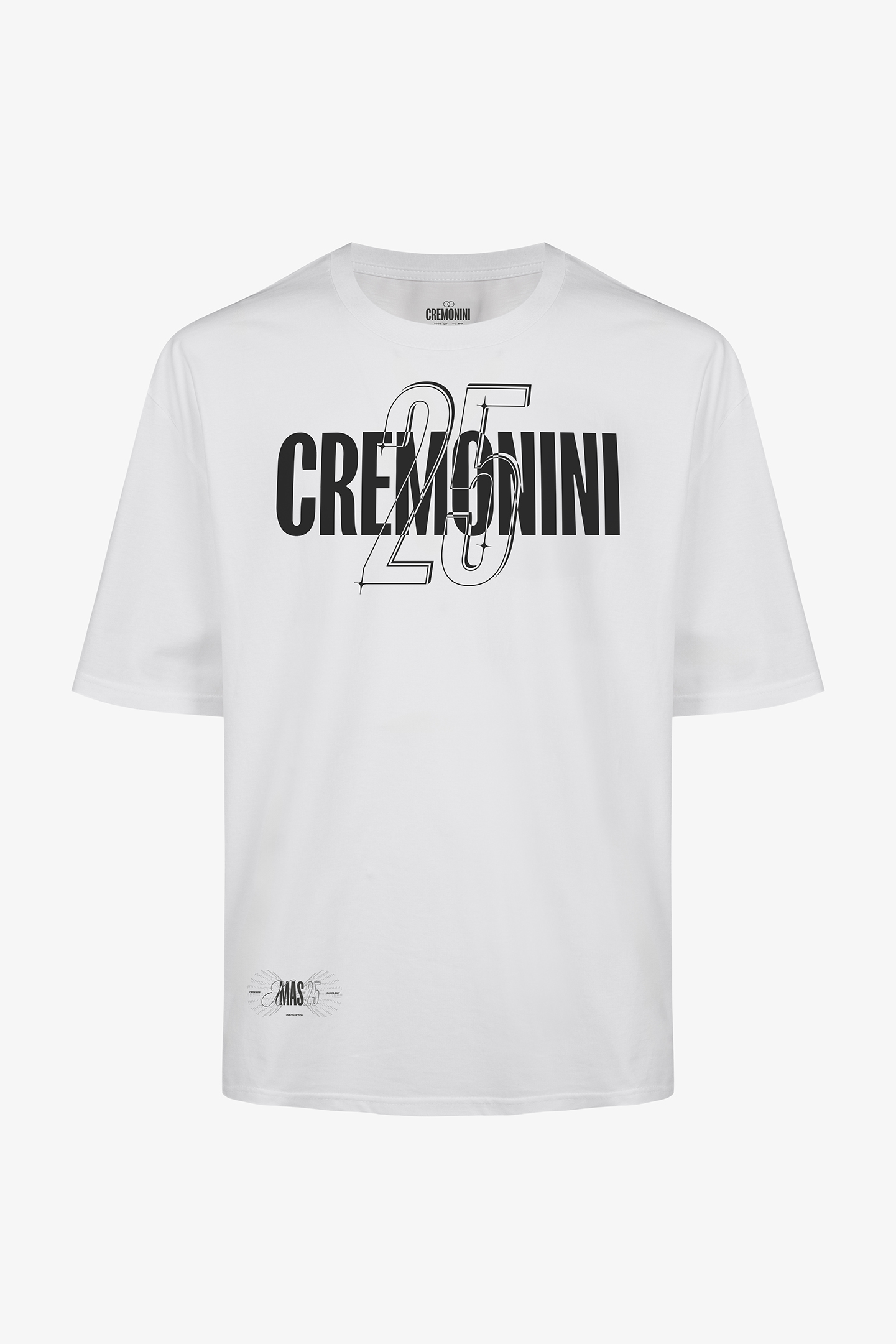 T-Shirt in cotone con vestibilità oversize della collezione “XMAS Live Collection” di Cesare Cremonini. Sul fronte è stampata un’ampia scritta “Cremonini” e il numero 25 con effetto “glass” Più in piccolo il marchio Xmas 25.